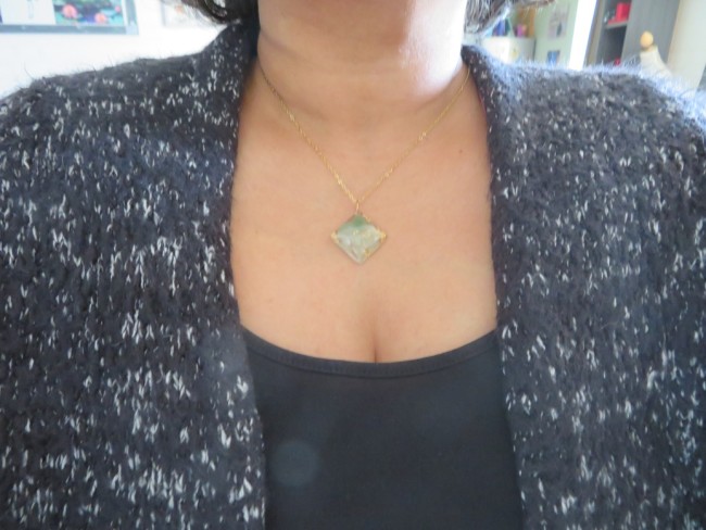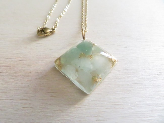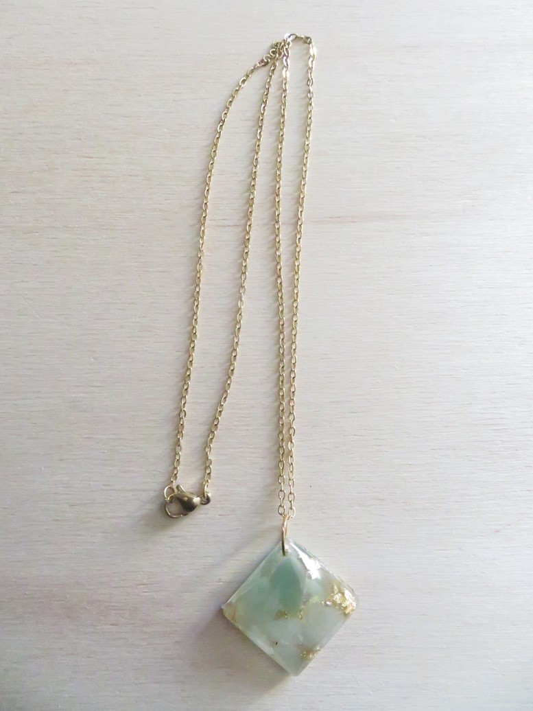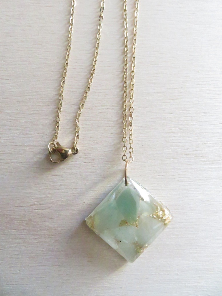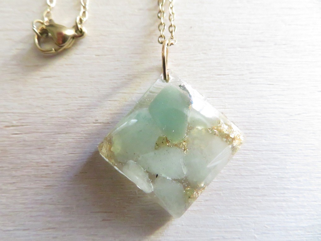 - Losange fait en résine incrusté de pierres naturelles Aventurine verte et flocons or - dimension : 2.7 cm