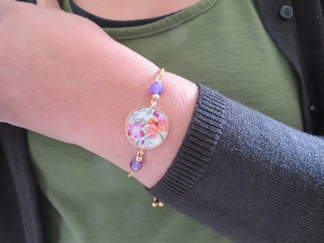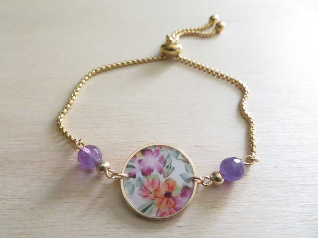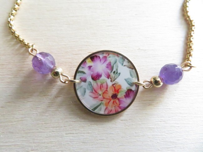Cabochon en acier inoxydable et résine avec motif fleurs orange et violet