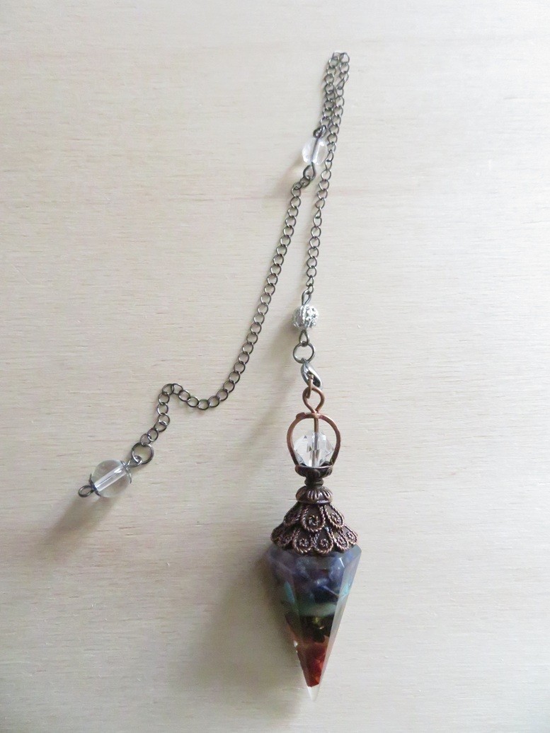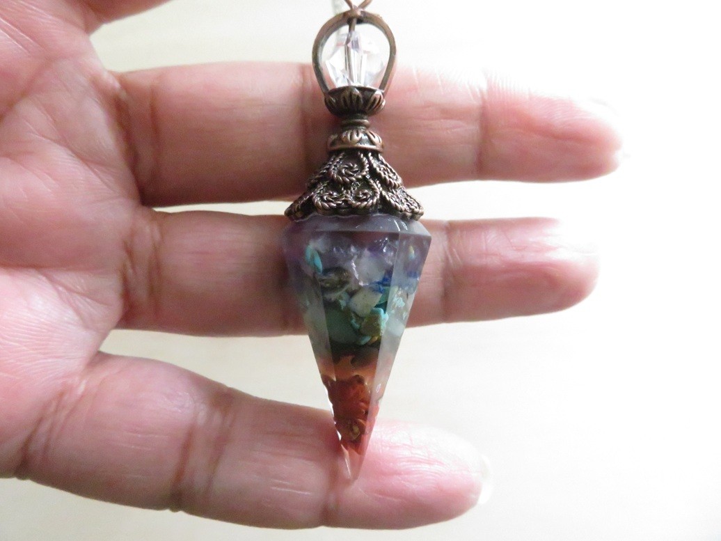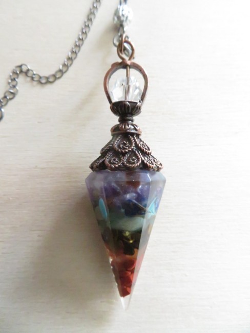 Très beau pendule fait en résine incrusté de pierres naturelles 7 chakras