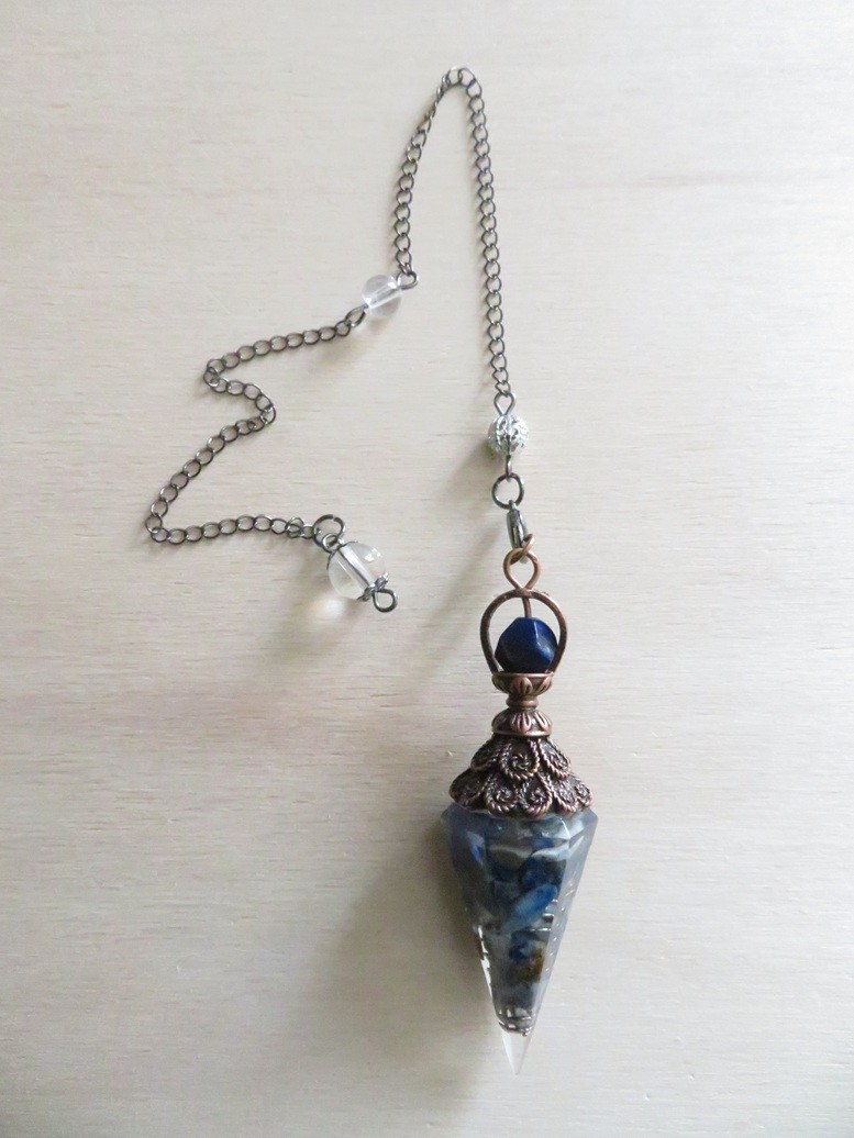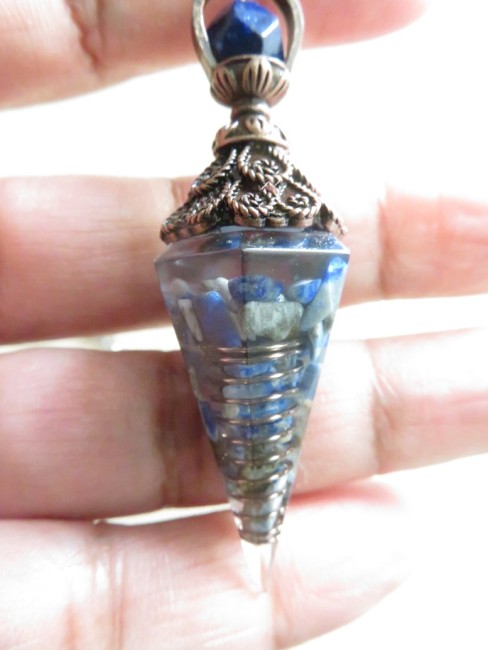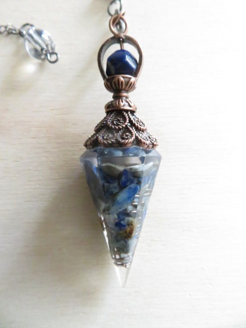 Très beau pendule fait en résine incrusté de pierres naturelles Sodalite