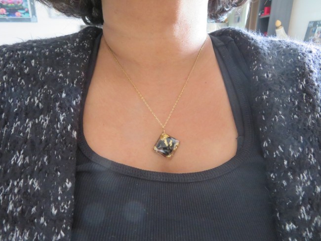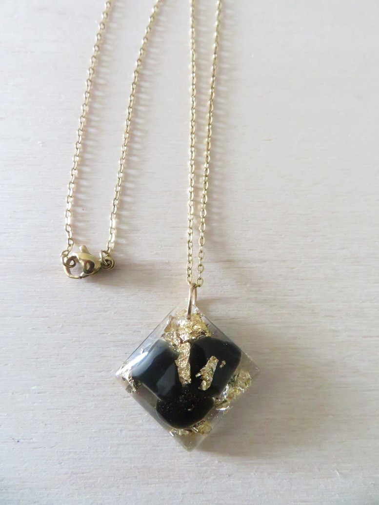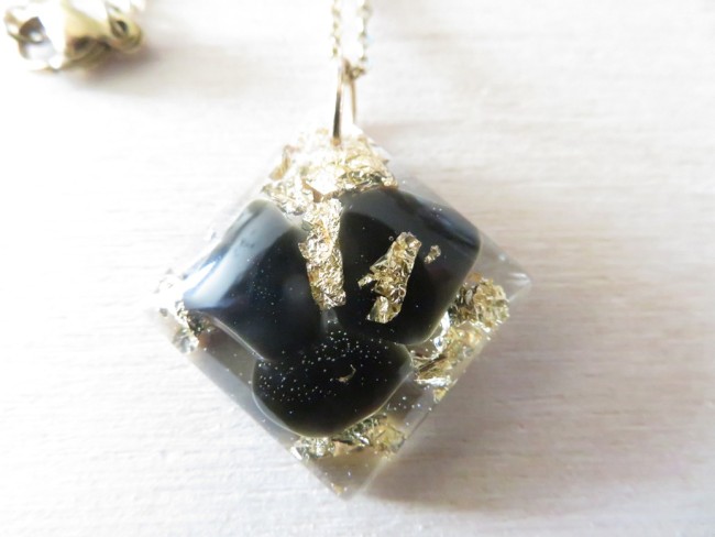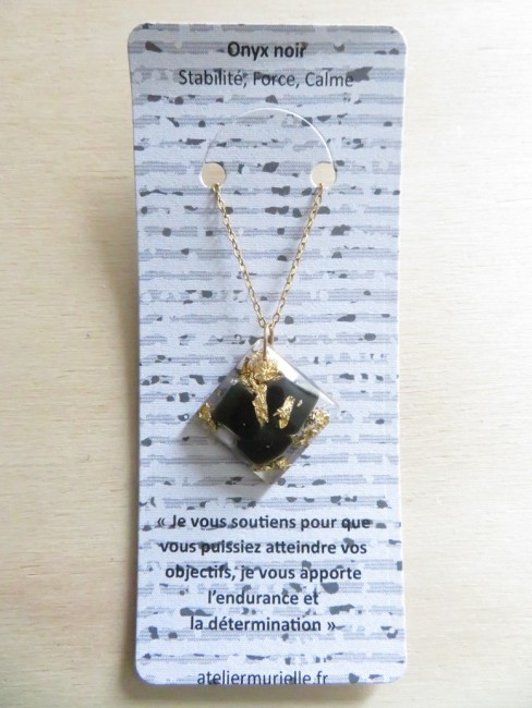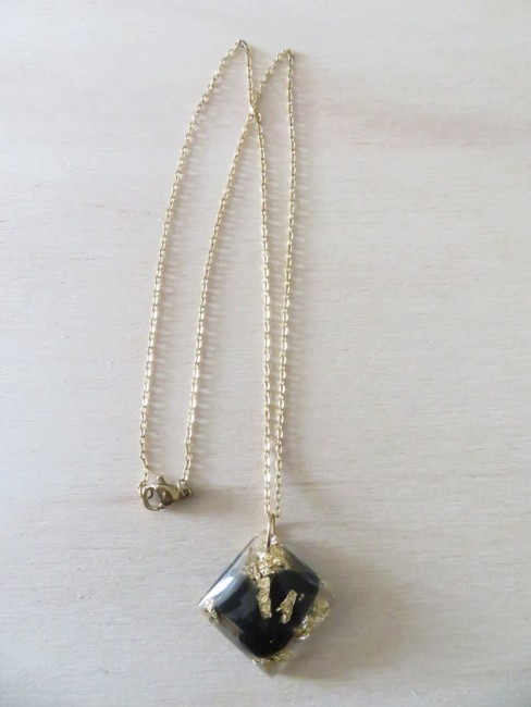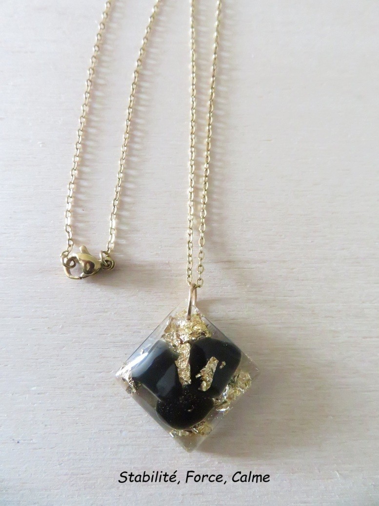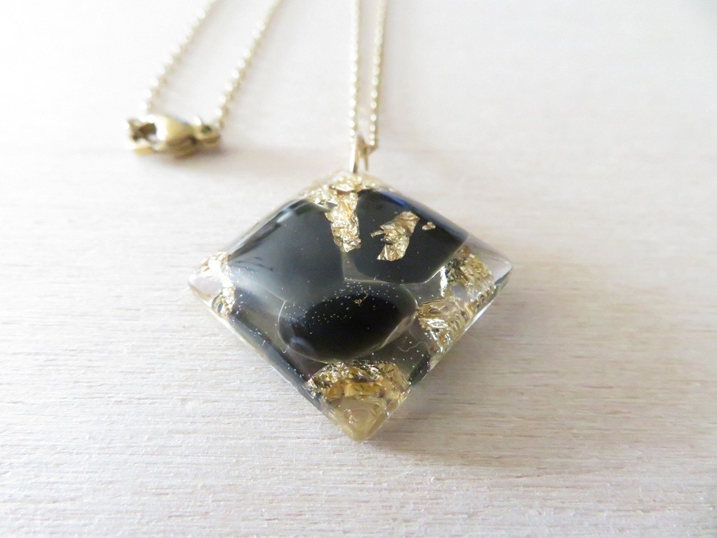 - Losange fait en résine incrusté de pierres naturelles Onyx noir et flocons or - dimension : 2.7 cm