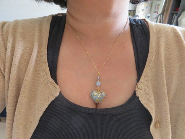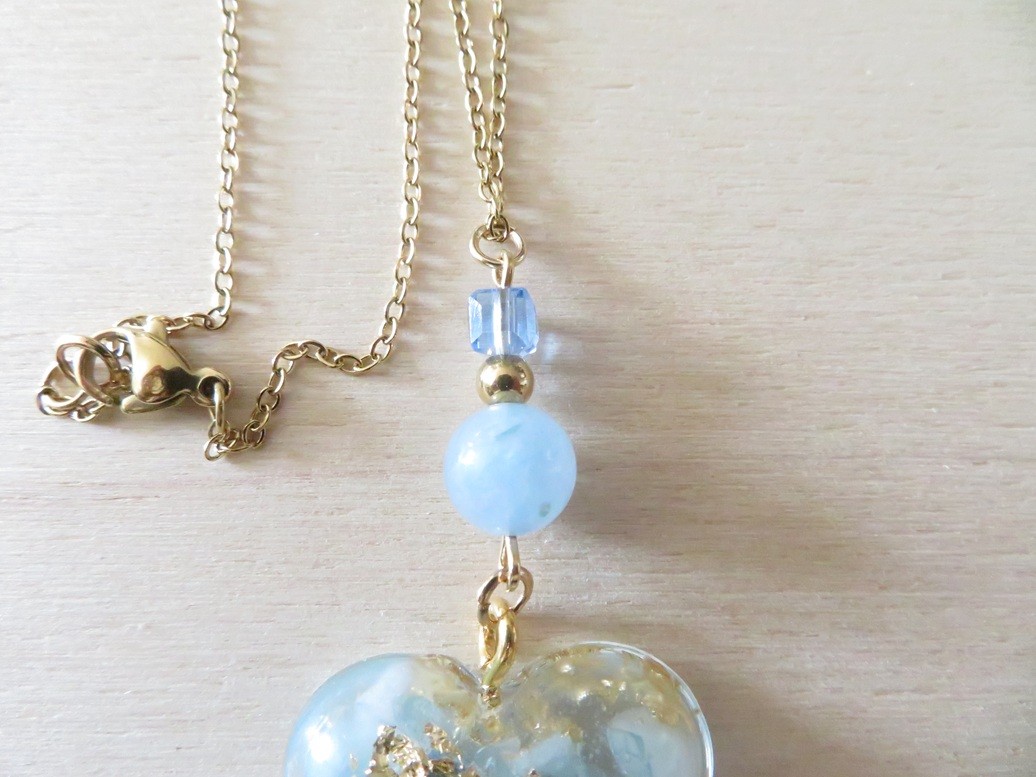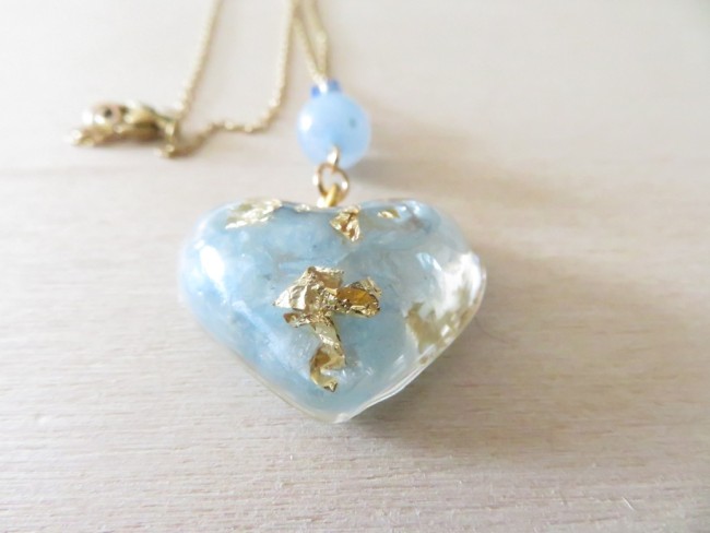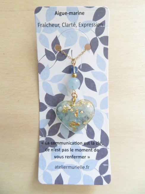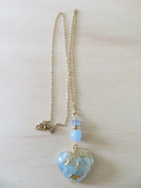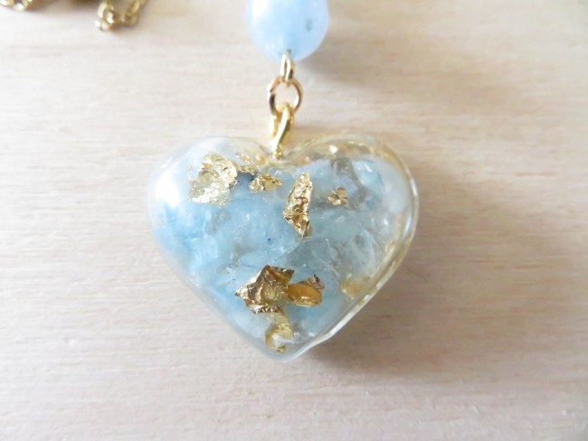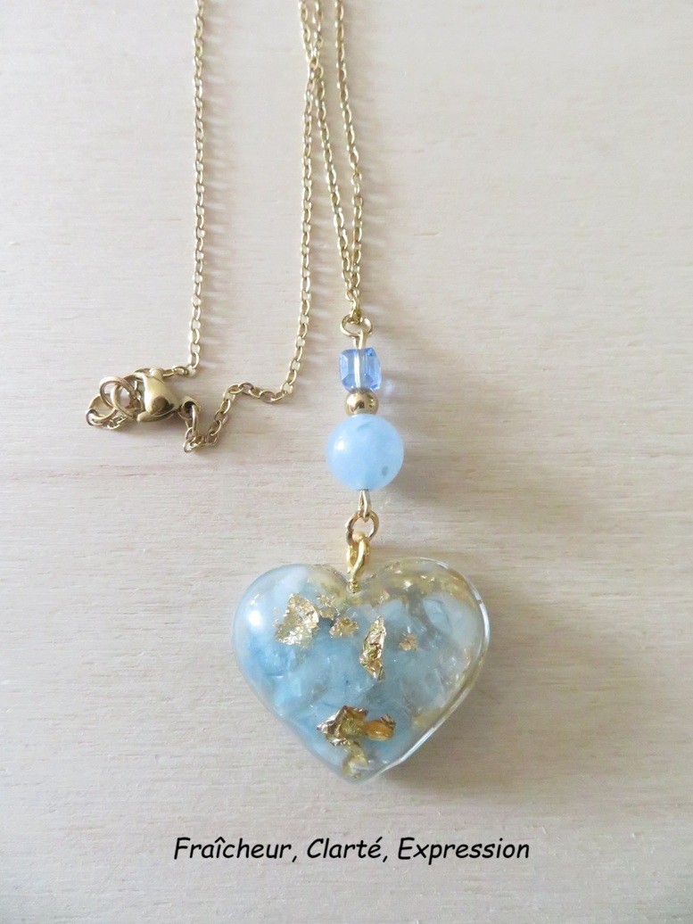 - Coeur fait en résine incrusté de pierres naturelles Aigue-marine et flocons or - dimension : 2.5 x 2.5 cm