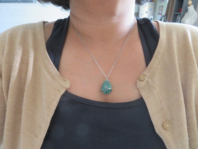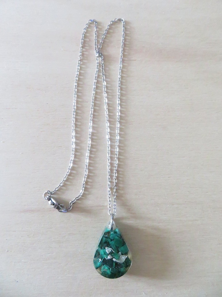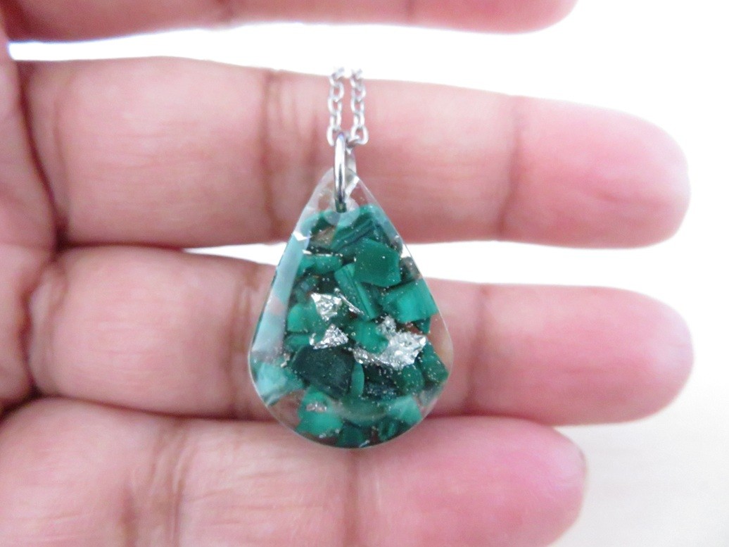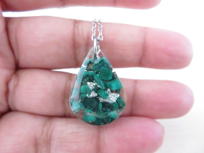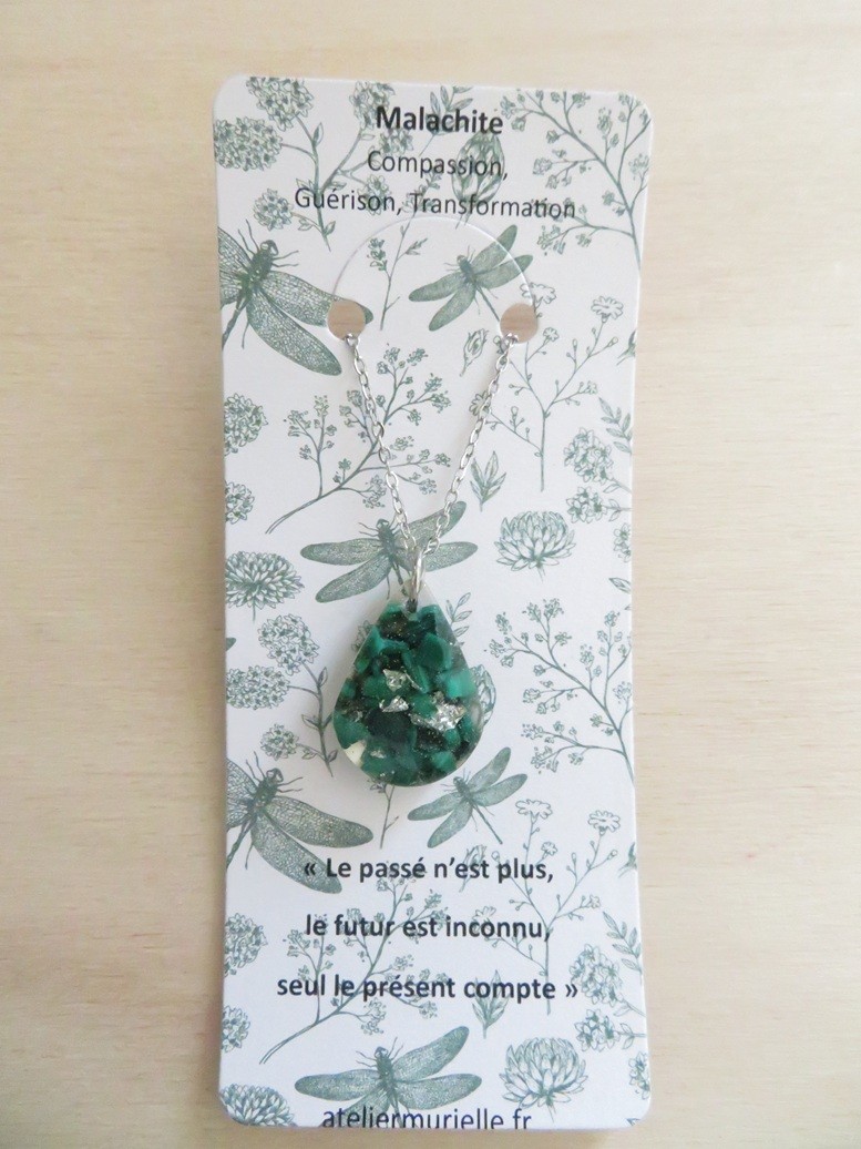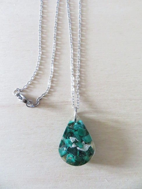 - Goutte faite en résine incrusté de pierres naturelles Malachite et flocons argent - dimension : 2.8 x 1.8 cm