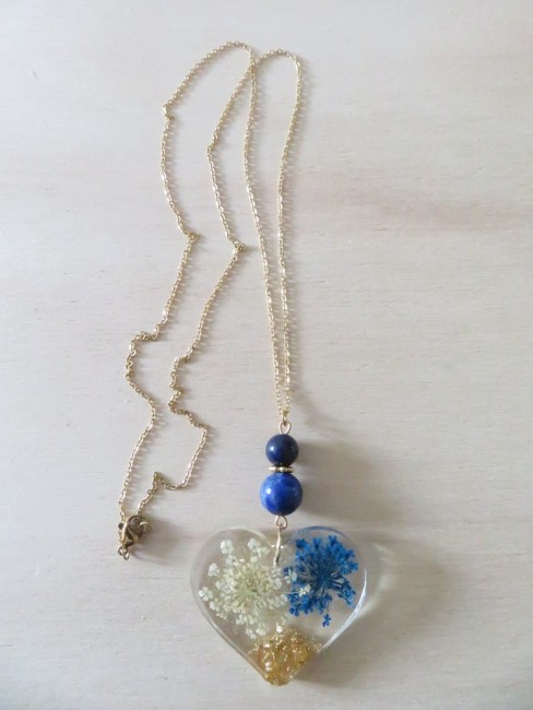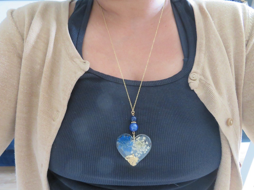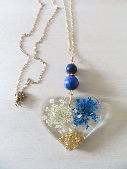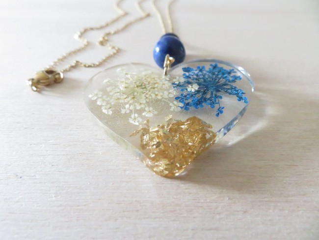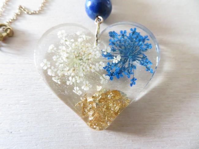- Coeur fait en résine incrusté de fleurs séchées blanche et bleu, flocons or - dimension : 35 x 40 mm