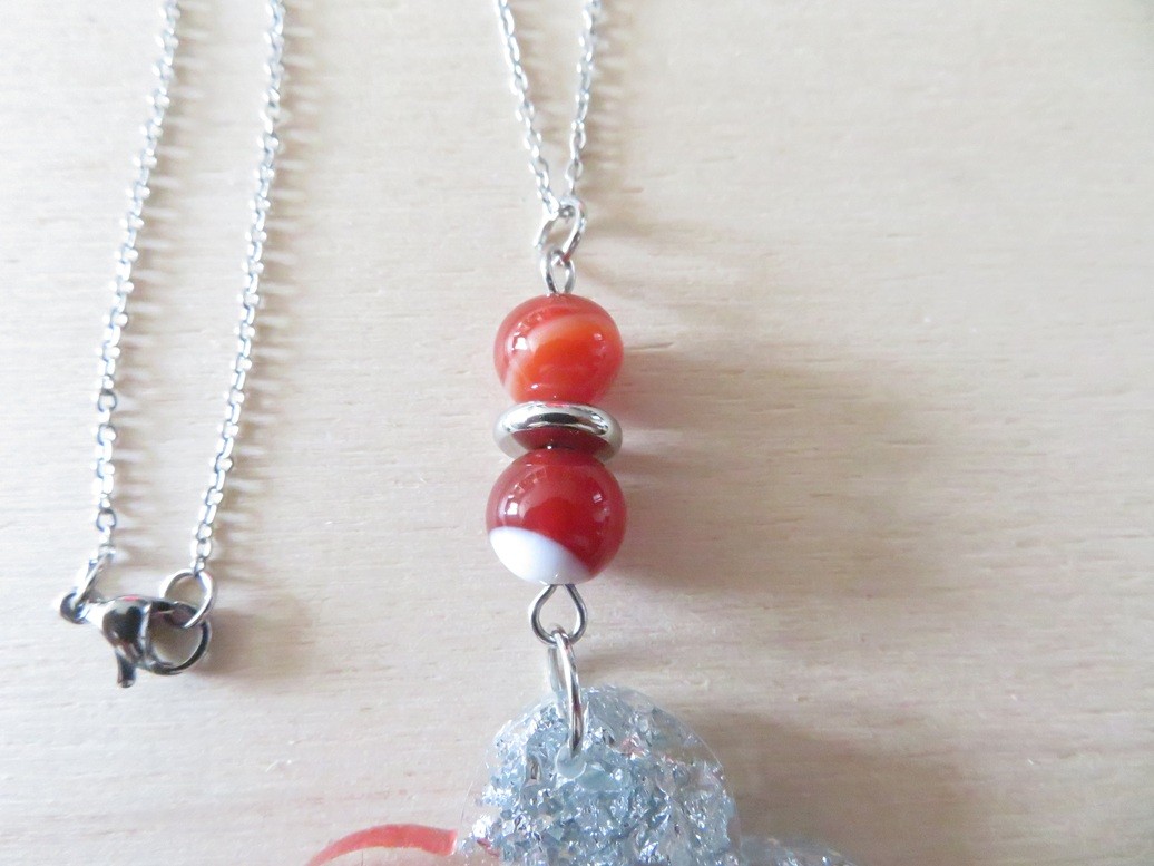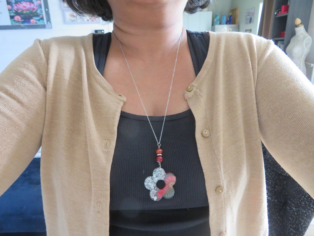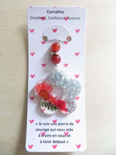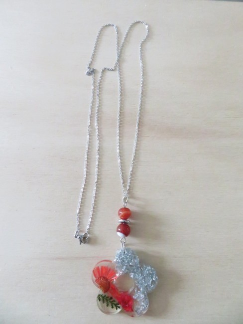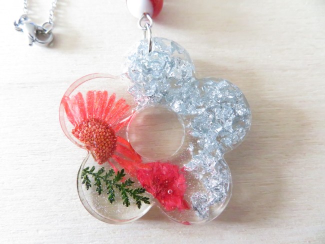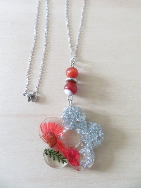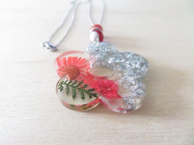- Fleur faite en résine incrusté de fleurs et feuille séchées, flocons argent