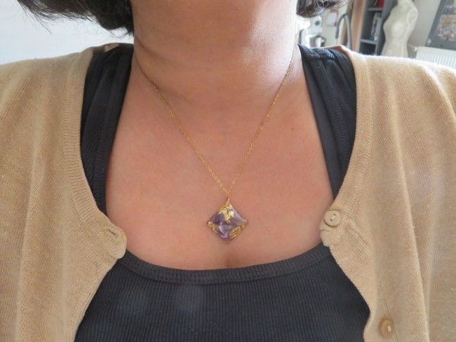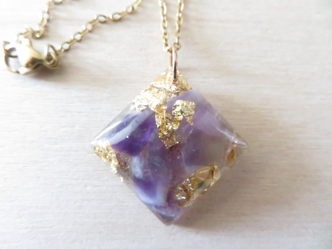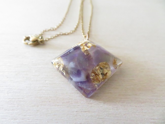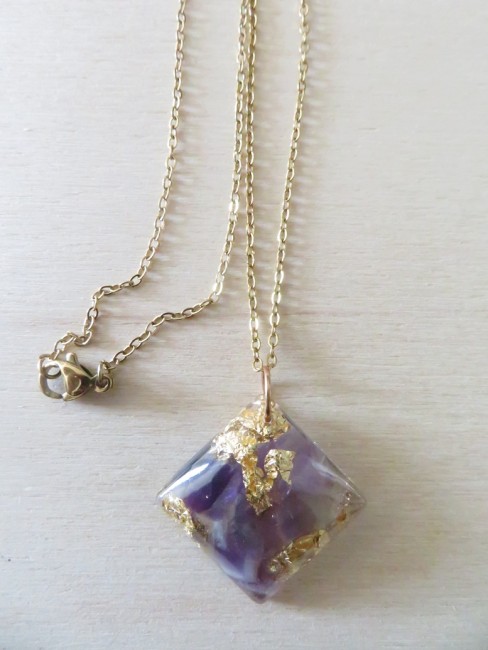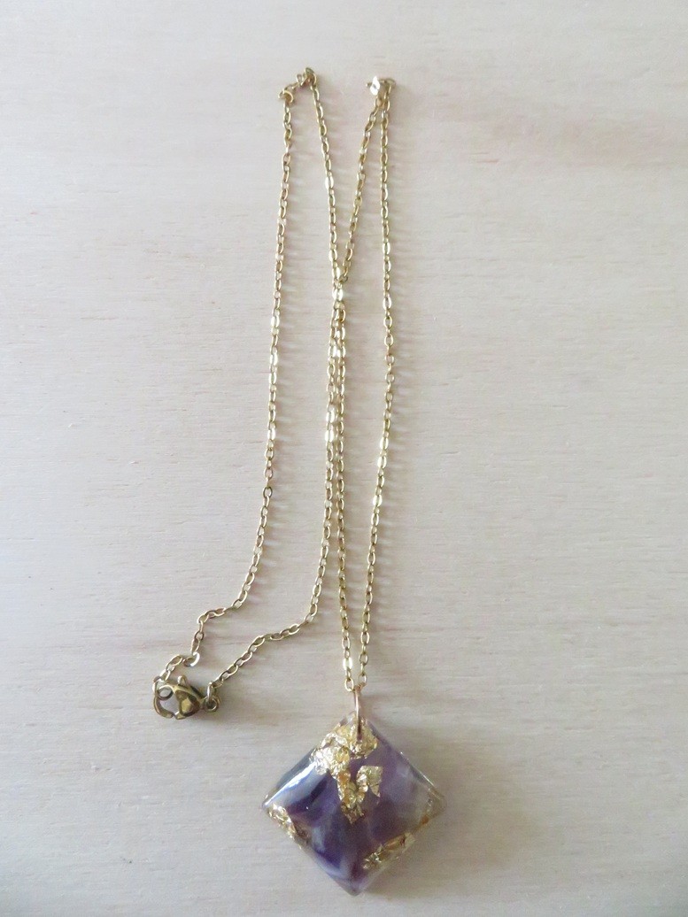 - Losange fait en résine incrusté de pierres naturelles Améthyste et flocons or - dimension : 2.7 cm