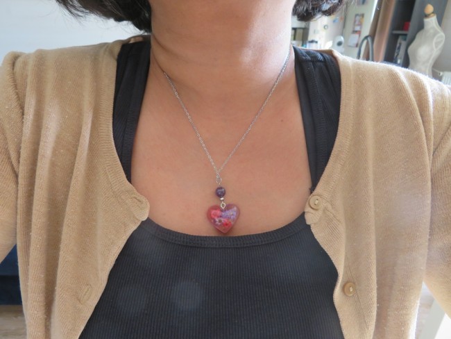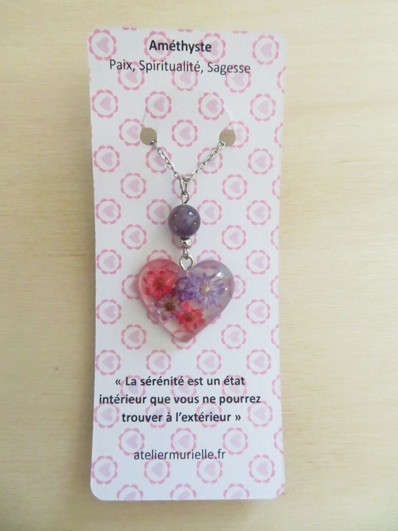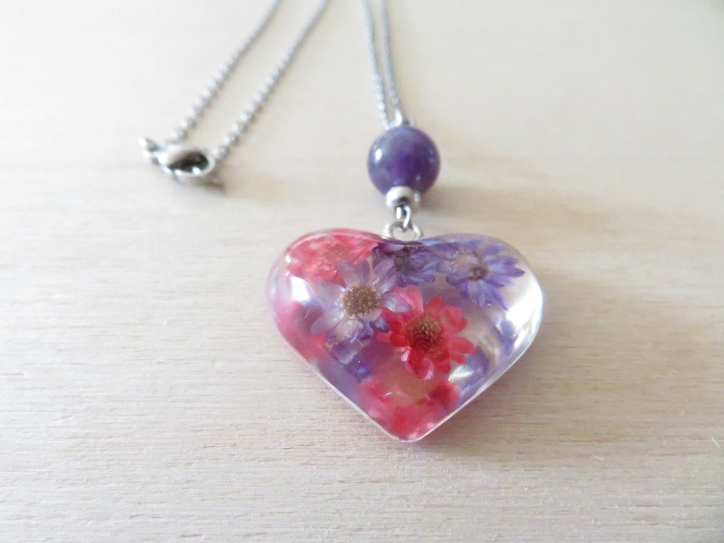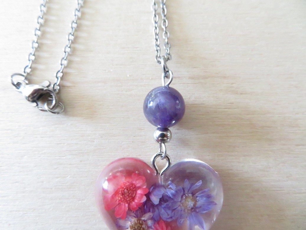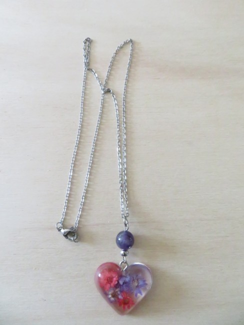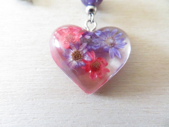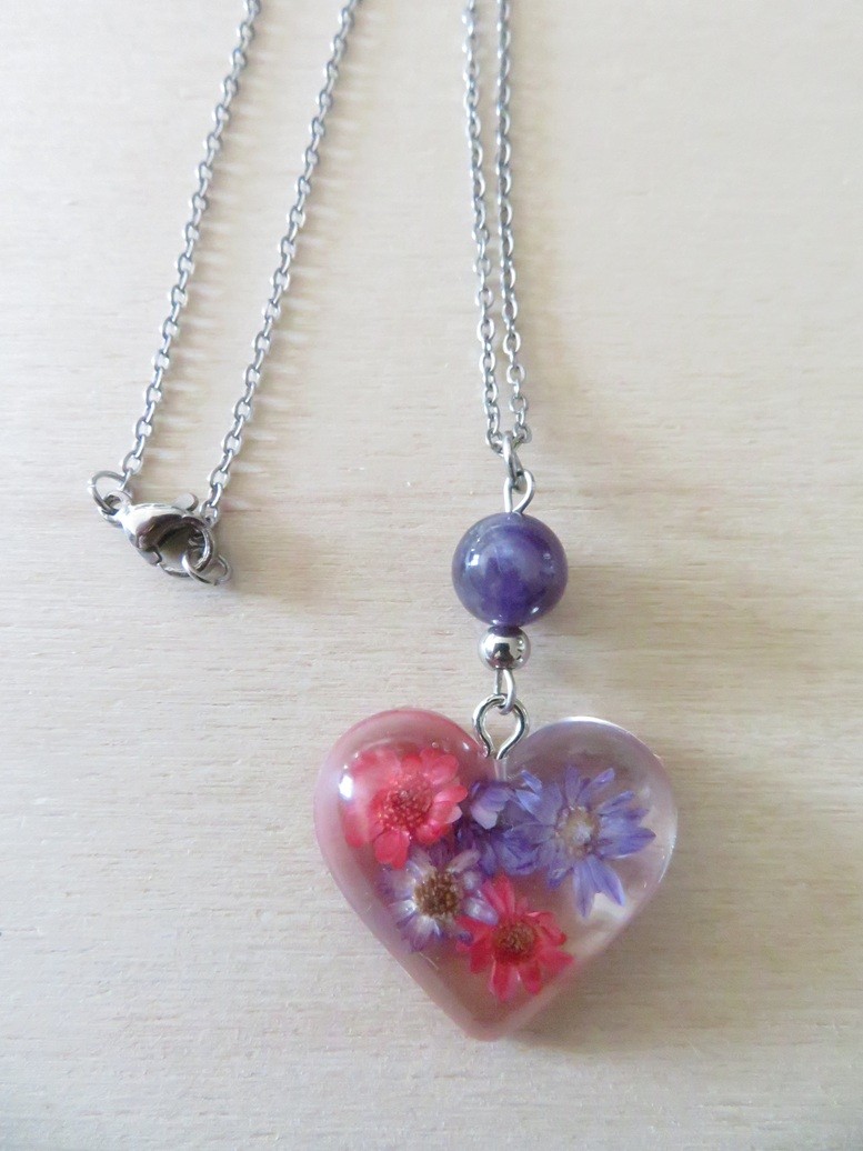 - Coeur fait en résine incrusté de petites fleurs séchées violet et rose fuchsia - dimension : 21 x 24 mm