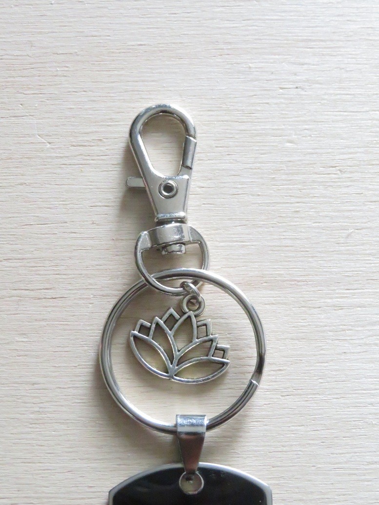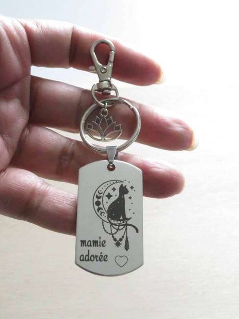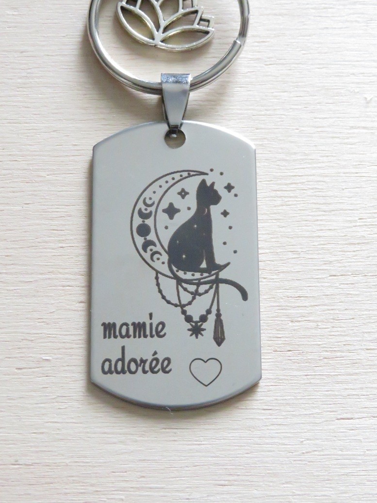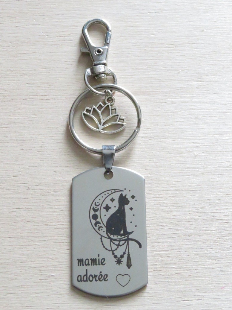 Très beau porte-clés ou bijou de sac gravure "Chat lune et Mamie adorée" sur une base en acier inoxydable. La fleur de lotus et le mousqueton sont en métal argenté