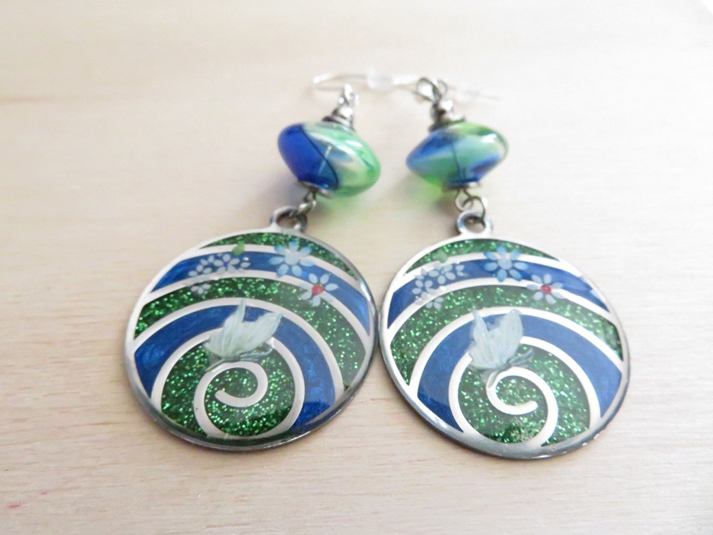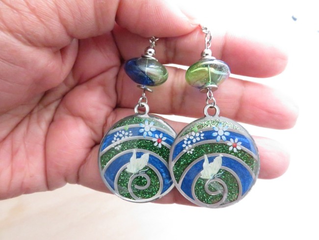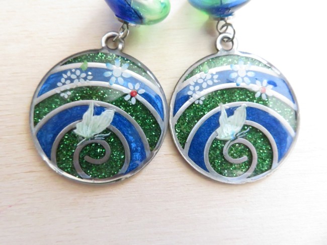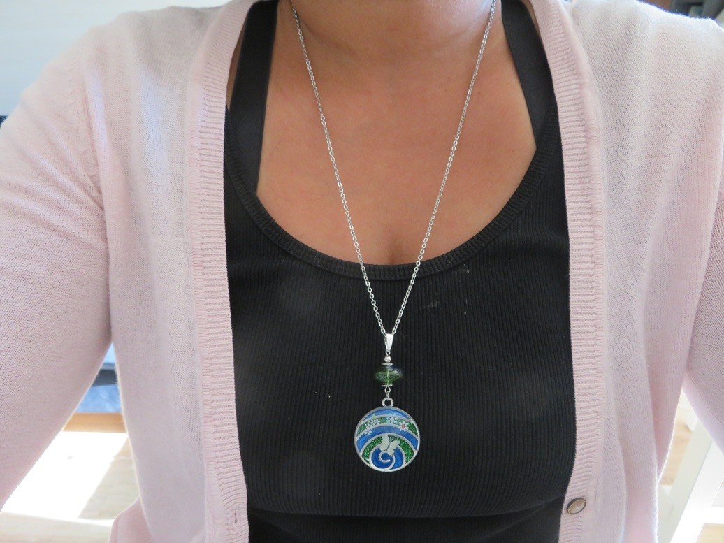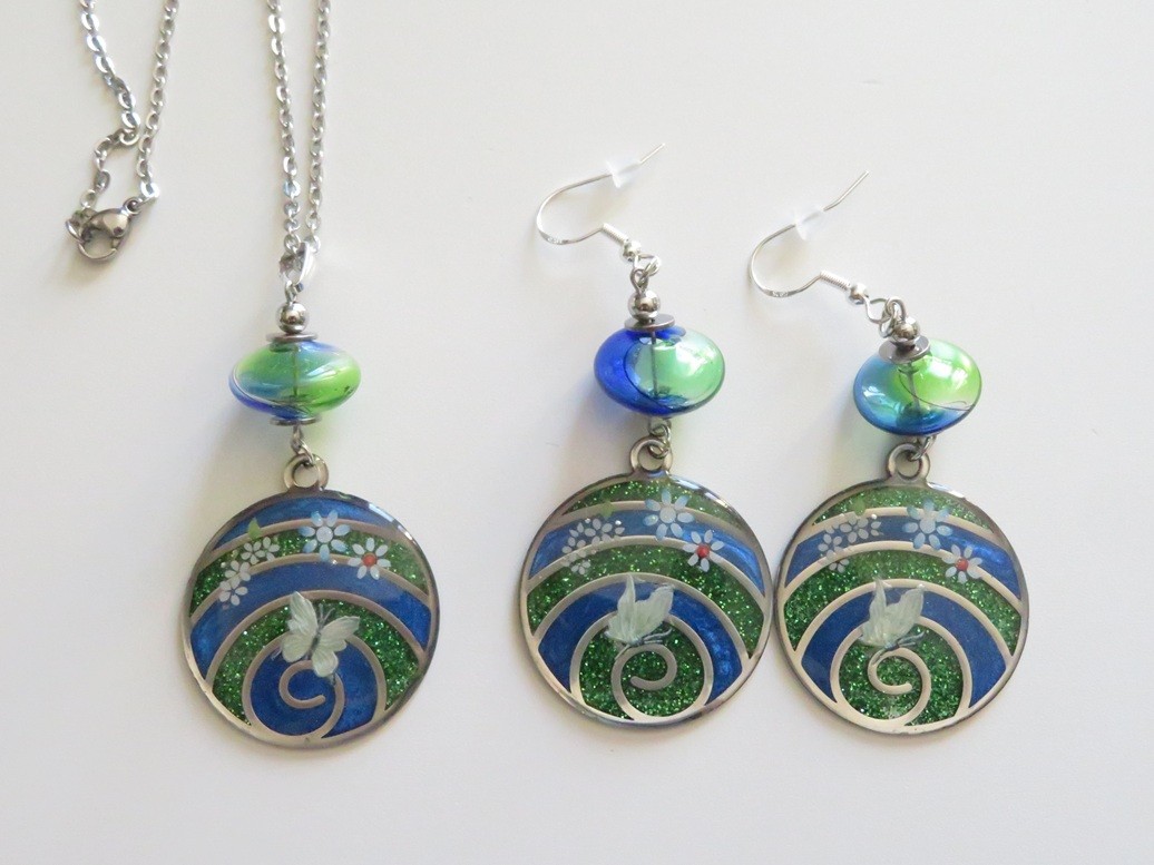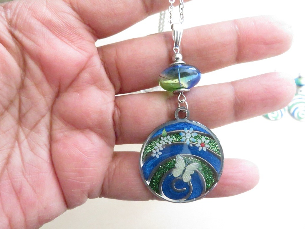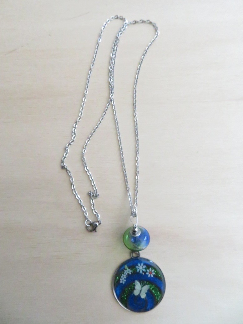 - 1 collier long avec chaine en acier inoxydable de 60 cm, pendentif (30 mm) en acier inoxydable, résine bleu et paillettes vertes décoré de fleurs et papillon, perles en verre assorties