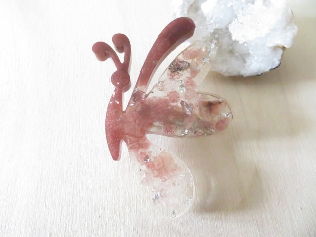 Broche papillon en résine et pierres naturelles Quartz framboise