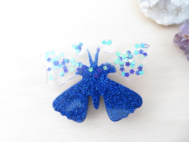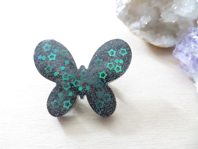 Broche papillon en résine à paillettes noir holographique et étoiles