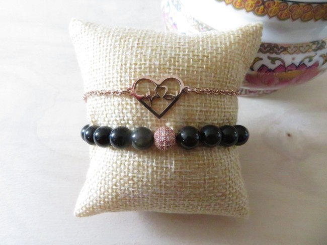 Bracelet obsidienne dorée et bracelet cœur or rose