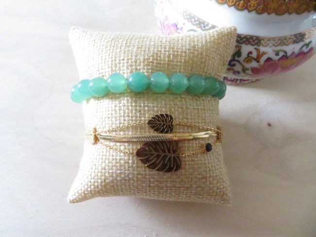 Bracelet en aventurine verte et bracelet feuilles en acier inoxydable or