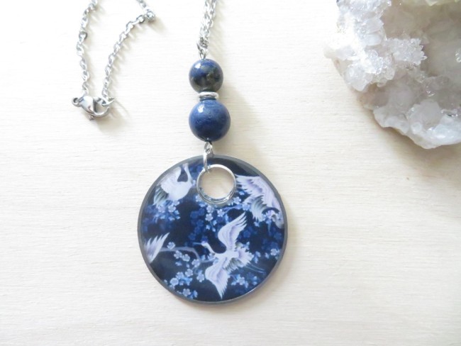Collier Lapis lazuli et Pendentif grues japonaises bleu nuit