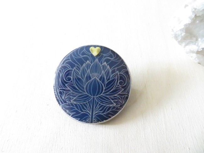 Broche ronde en bois Fleur de lotus et lune bleu nuit