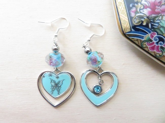 Boucles d'oreilles fantaisie argent 925 et des cœurs bleu turquoise avec papillon