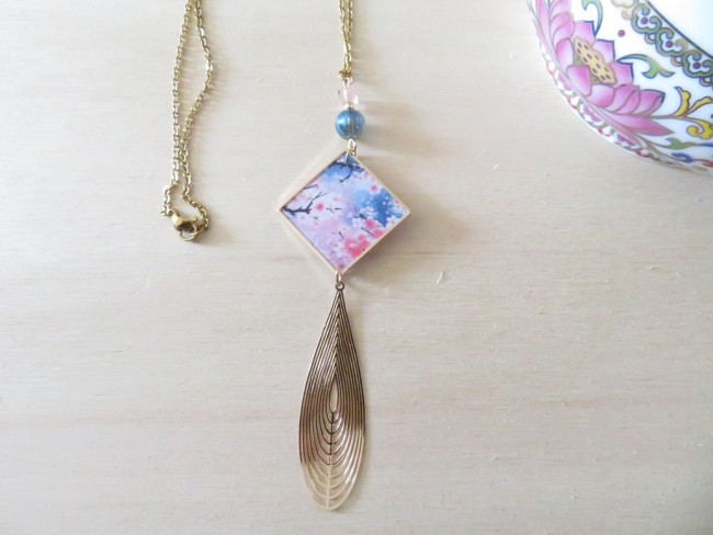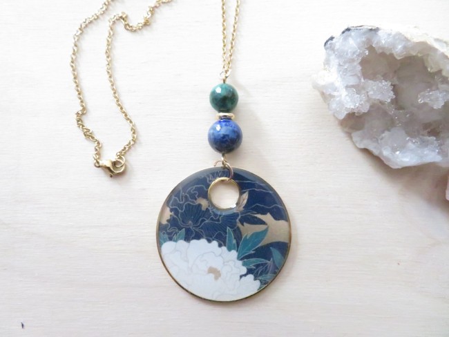 Collier Azurite Malachite et Pendentif fleurs japonais