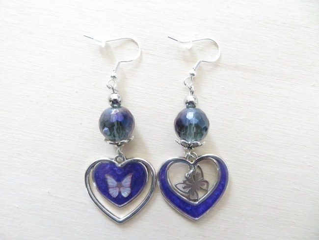 Boucles d'oreilles fantaisie argent 925 et des cœurs violet avec papillons