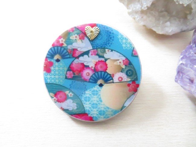 Broche en bois ronde motif éventail japonais bleu vert