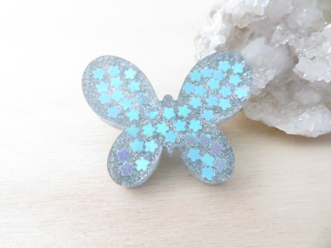 Broche papillon en résine à paillettes holographique gris clair et petites fleurs