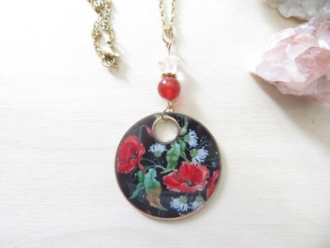 Collier Agate rouge et Pendentif coquelicots