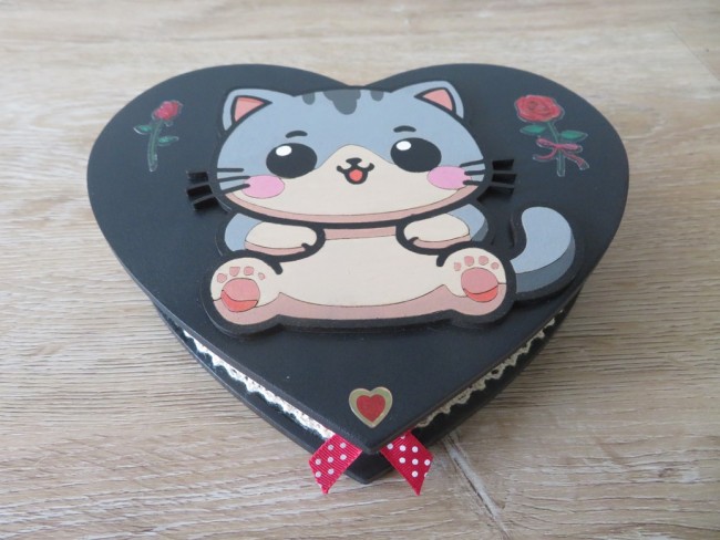 Boite à bijoux avec miroir en forme de cœur noir, décoration chat gris en bois