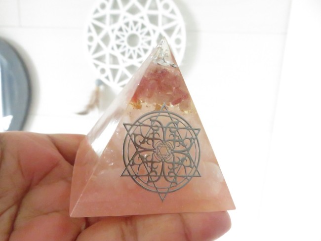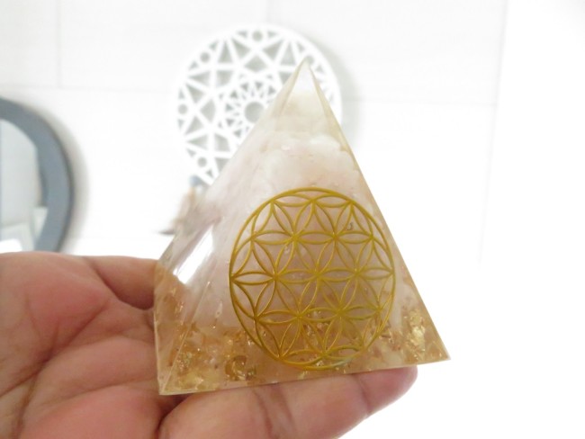 Orgonite pyramide Quartz rose, Fleur de vie