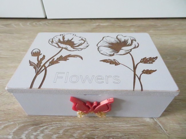 Boite de rangement en bois avec gravure coquelicots et papillon en résine