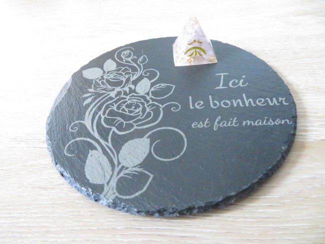 Orgonite pyramide en Améthyste lavande et support en ardoise avec gravure