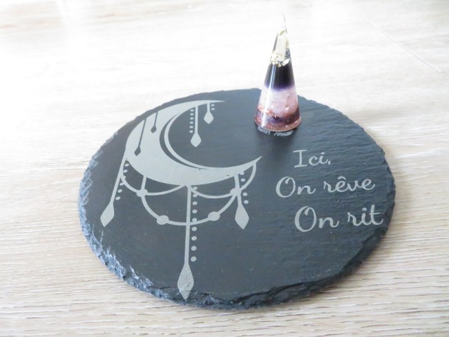 Orgonite cône en Améthyste et support en ardoise avec gravure