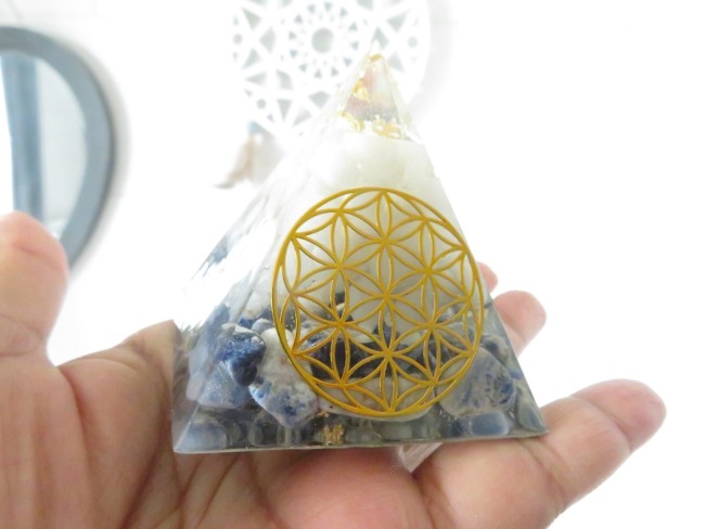 Orgonite pyramide Jade blanc, Sodalite, Fleur de vie