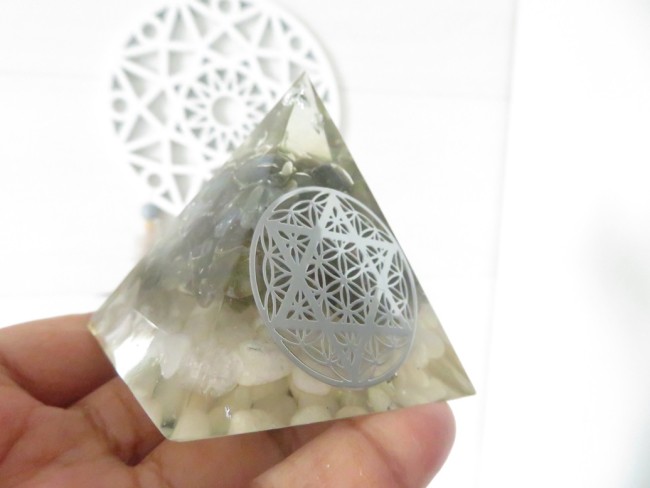 Orgonite pyramide Jade blanc, Labradorite, Fleur de vie Etoile