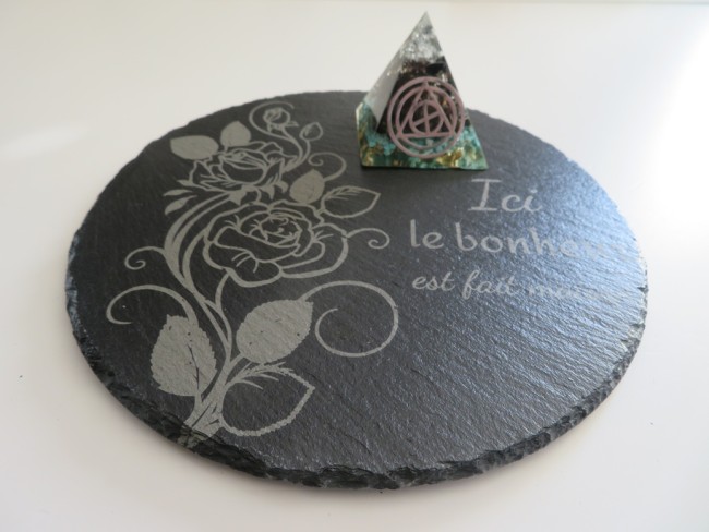 Orgonite pyramide Turquoise, Quartz fumé, Symbole sacré, Plaque en ardoise gravure roses et citation
