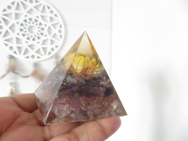Orgonite pyramide Améthyste, Améthyste lavande, Fleur séchée