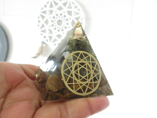 Orgonite pyramide Labradorite, Œil de tigre, Symbole sacré