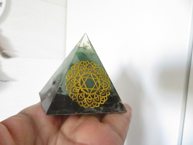 Orgonite pyramide Onyx noir, Aventurine verte, Symbole sacré